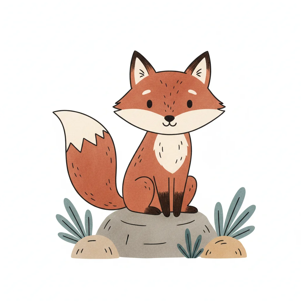 Illustration eines lächelnden Fuchses, der auf einem Felsen sitzt, umgeben von kleinen Pflanzen.