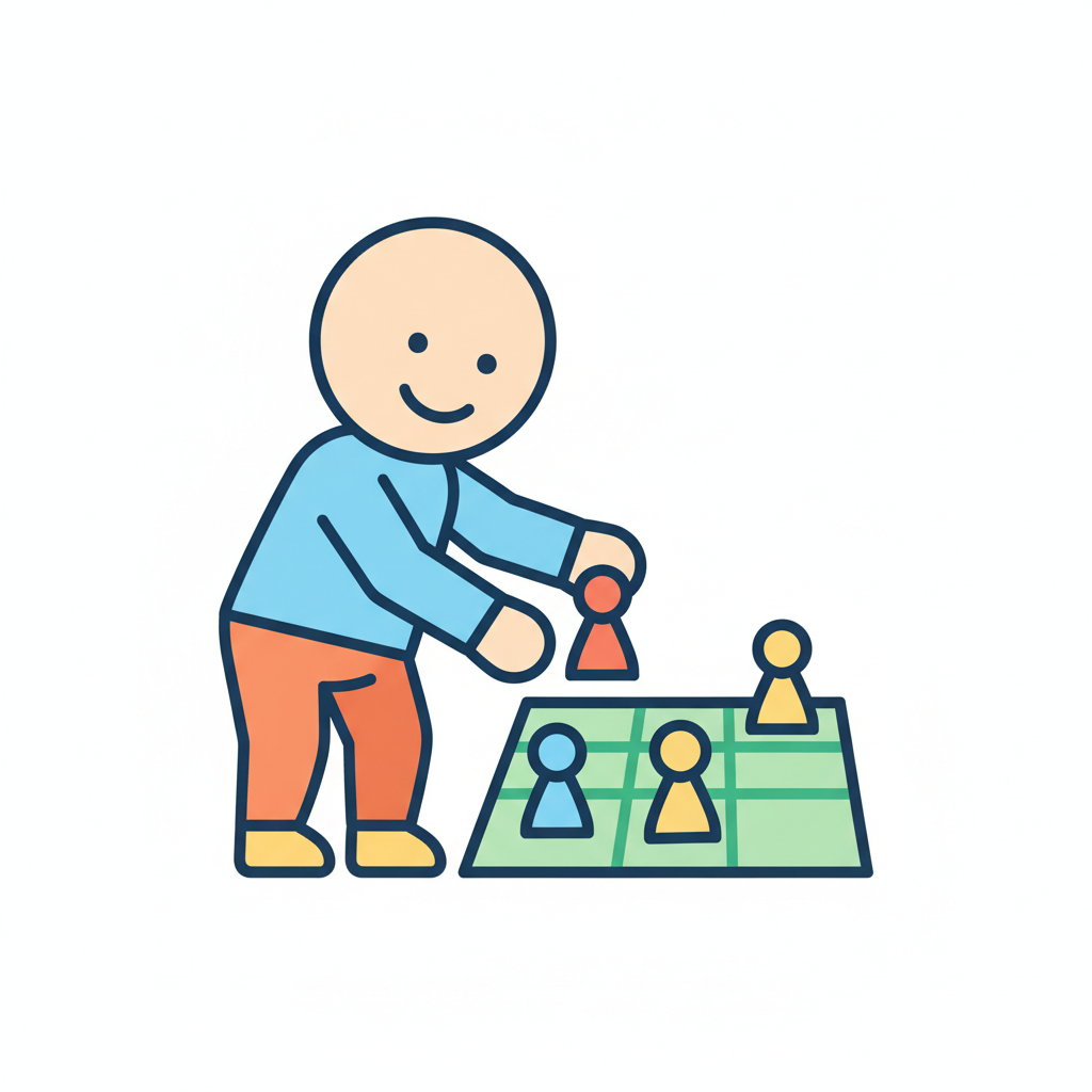 Ein Kind spielt mit Figuren auf einem Spielfeld.