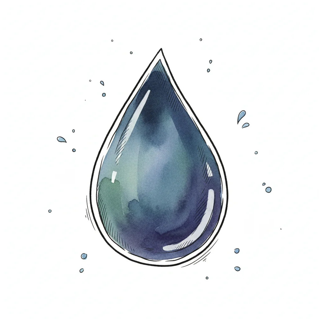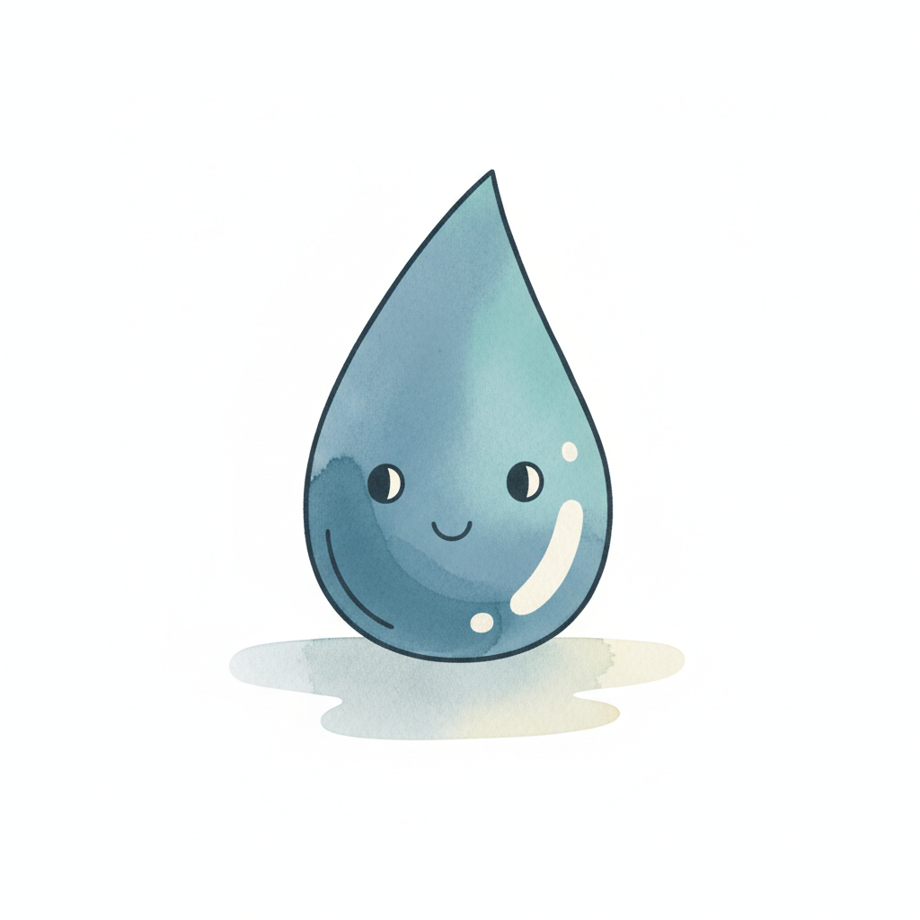 Niedlicher, lächelnder Wassertropfen im Cartoon-Stil mit Aquarell-Textur auf weißem Hintergrund.