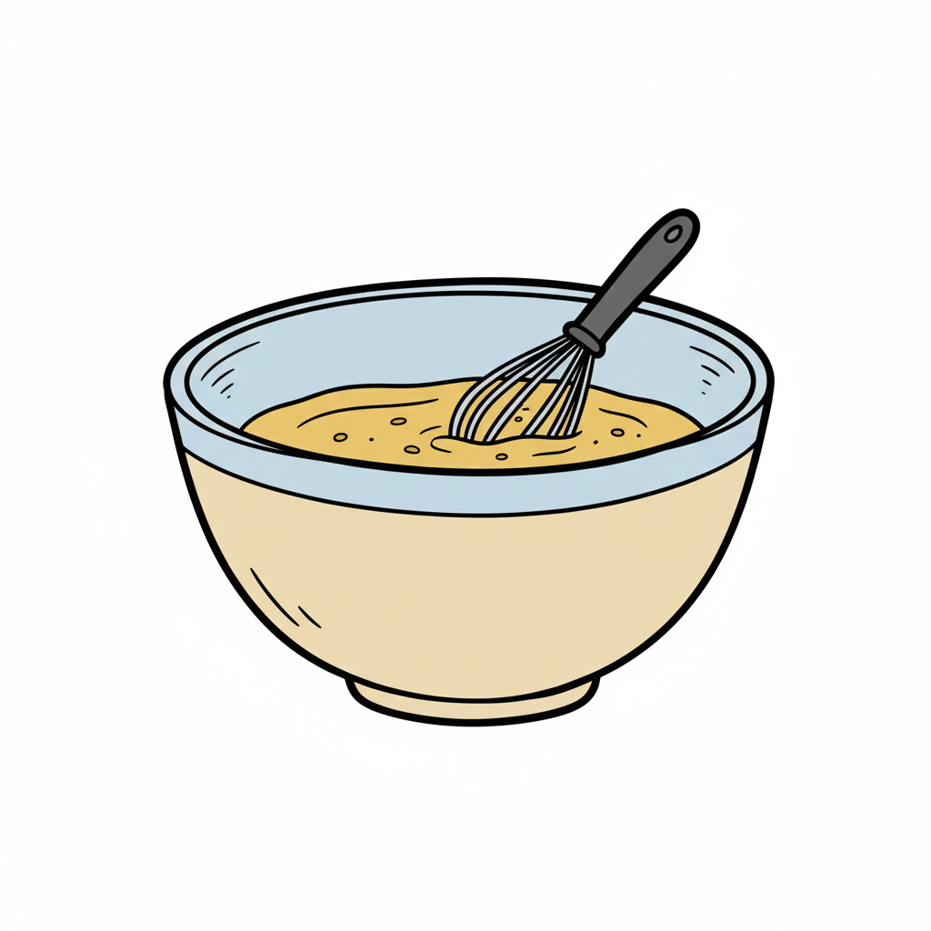 Illustration einer Rührschüssel mit flüssigem Teig und einem Schneebesen.