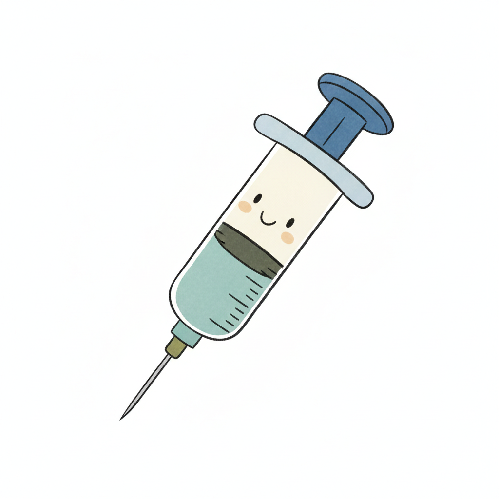 Gezeichnete Spritze mit blauer Flüssigkeit und Nadel auf weißem Hintergrund.