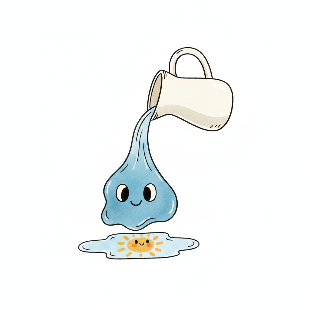 Niedlicher Krug gießt lächelnde blaue Flüssigkeit auf eine Pfütze mit lächelnder Sonne.