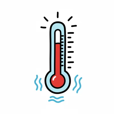 Illustriertes Thermometer mit hoher roter Flüssigkeit und Hitze-Symbolen, zeigt hohe Temperatur an.