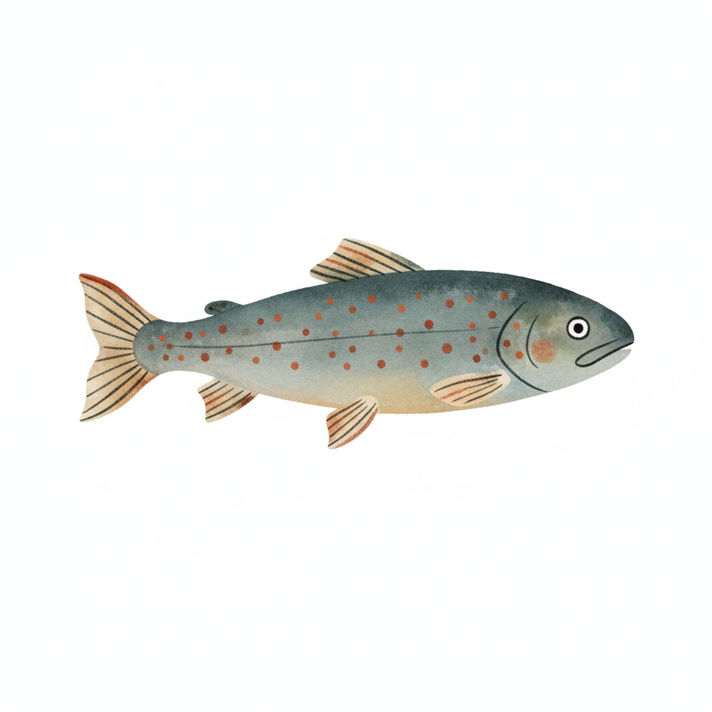Bunte, cartoonartige Forelle mit orangefarbenen Flecken.