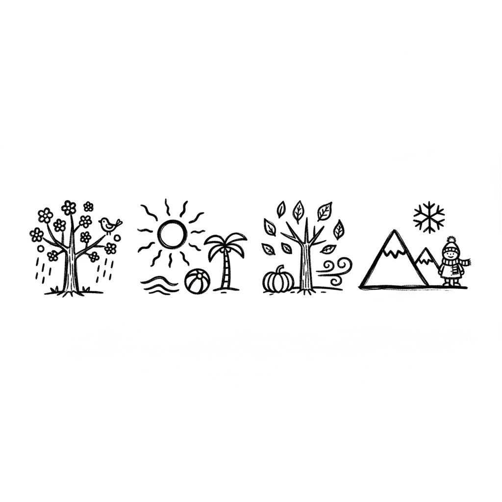Stilisierte Schwarz-Weiß-Darstellung der vier Jahreszeiten: Frühling, Sommer, Herbst, Winter.