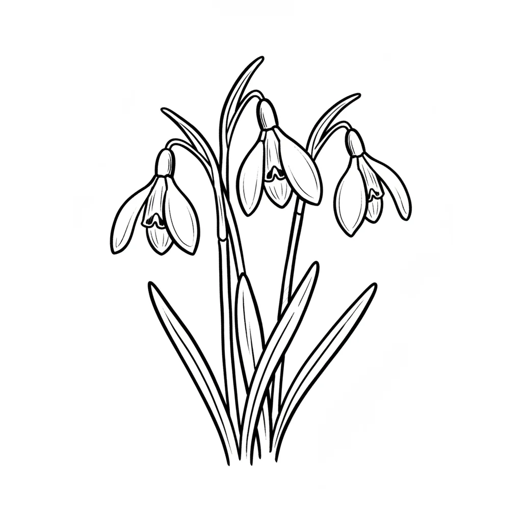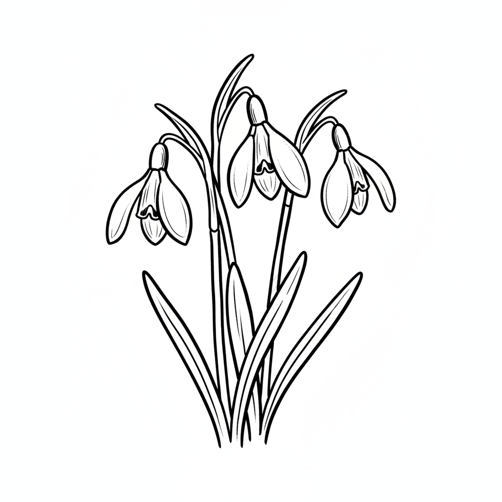 Schwarz-weiß-Illustration von drei Schneeglöckchen mit Blättern, die den Frühling ankündigen.