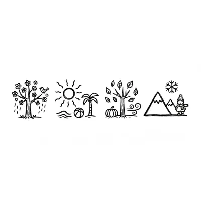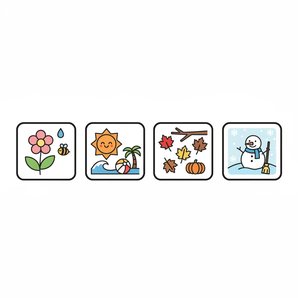 Vier Icons stellen die Jahreszeiten dar: Frühling, Sommer, Herbst und Winter mit typischen Symbolen.