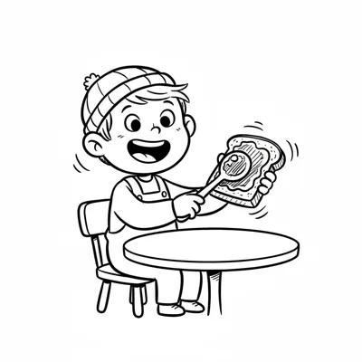 Glücklicher Junge mit Mütze schmiert Aufstrich auf Toastbrot am Tisch. Schwarz-Weiß-Bild.