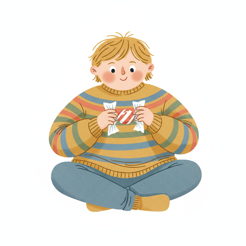 Ein Junge sitzt und hält eine Süßigkeit in den Händen.