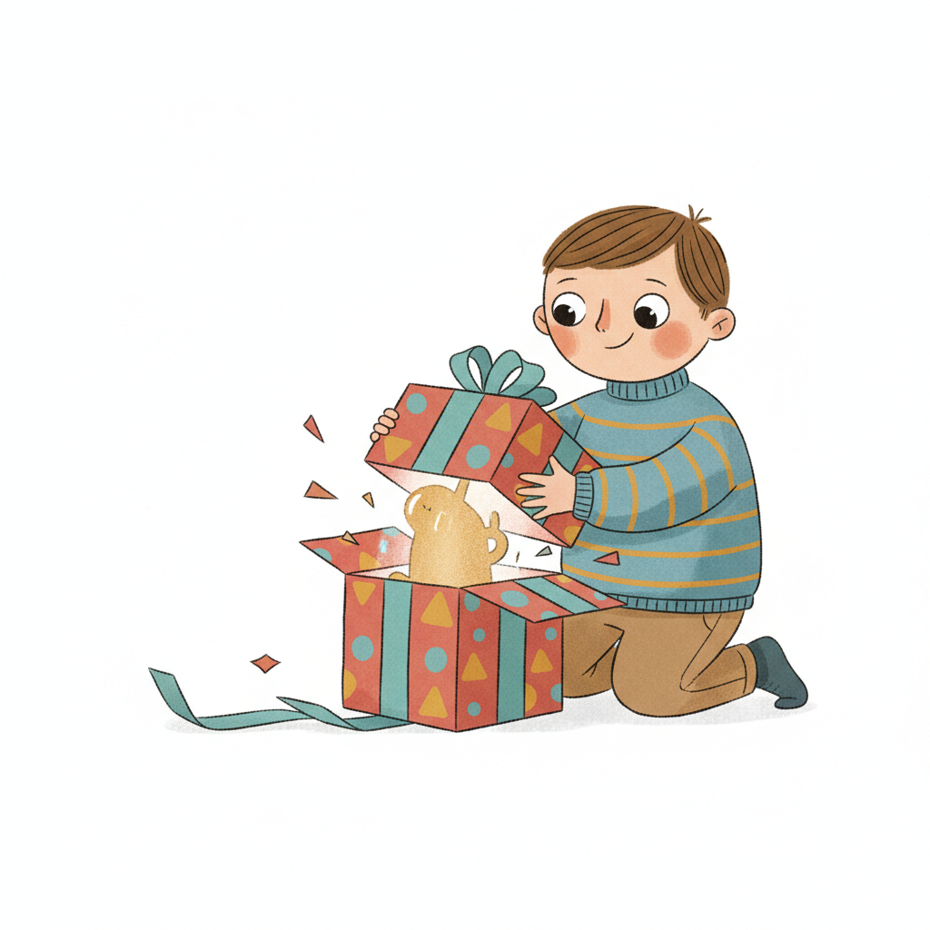 Ein Junge öffnet begeistert ein Geschenk mit einer Tasse darin.