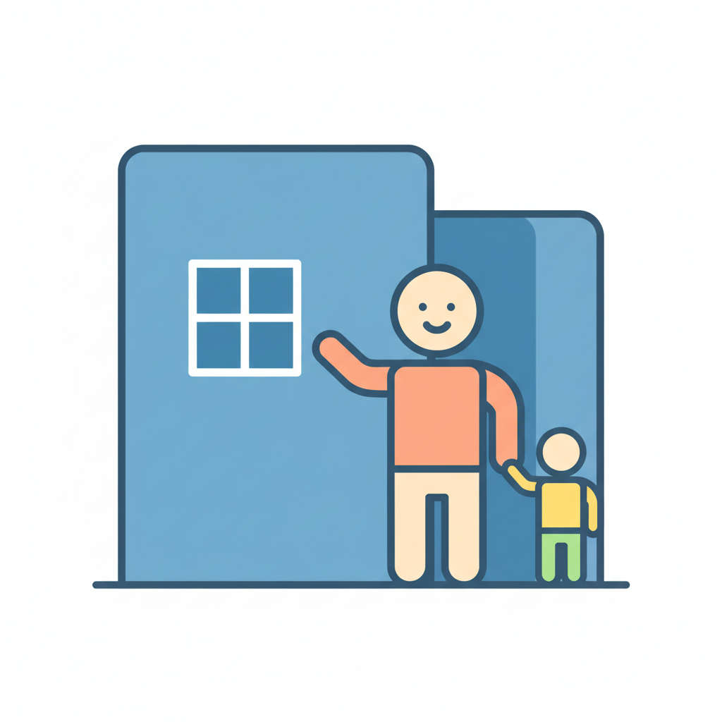 Eine Figur mit einem Kind vor einem Haus, fröhlich und einladend.