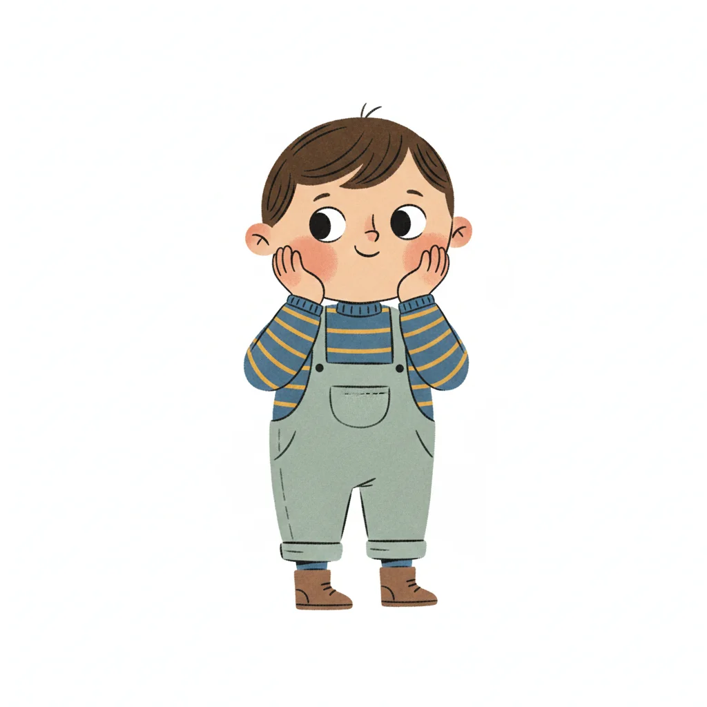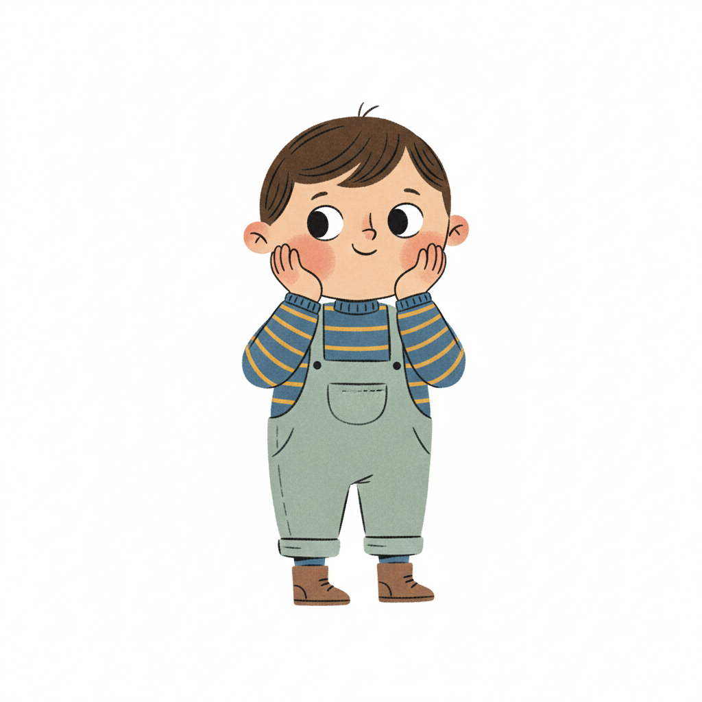 Handgezeichnete Kinderbuchillustration im modernen skandinavisch-nordischen Stil. Minimalistische, freundliche Figur mit einfachen Formen und leicht unregelmäßigen, handgezeichneten Linien. Ruhige, gedeckte Farbpalette, viel freie Fläche, reduzierte Details, sanfte Papier- oder Aquarellstruktur. Warme, ruhige, leicht humorvolle Stimmung, flächige Komposition ohne starke Perspektive, moderner nordischer Illustrationsstil, charmant und zeitlos.