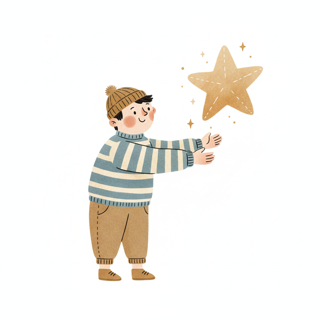 Ein Junge greift nach einem goldenen Stern und lächelt dabei.