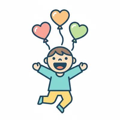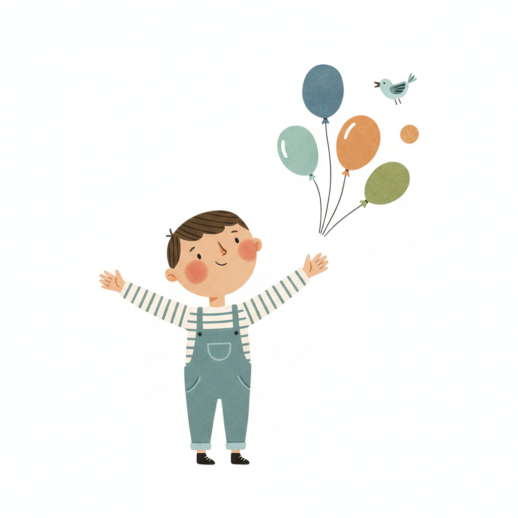Ein Junge mit Ballons und einem kleinen Vogel, der fröhlich wirkt.