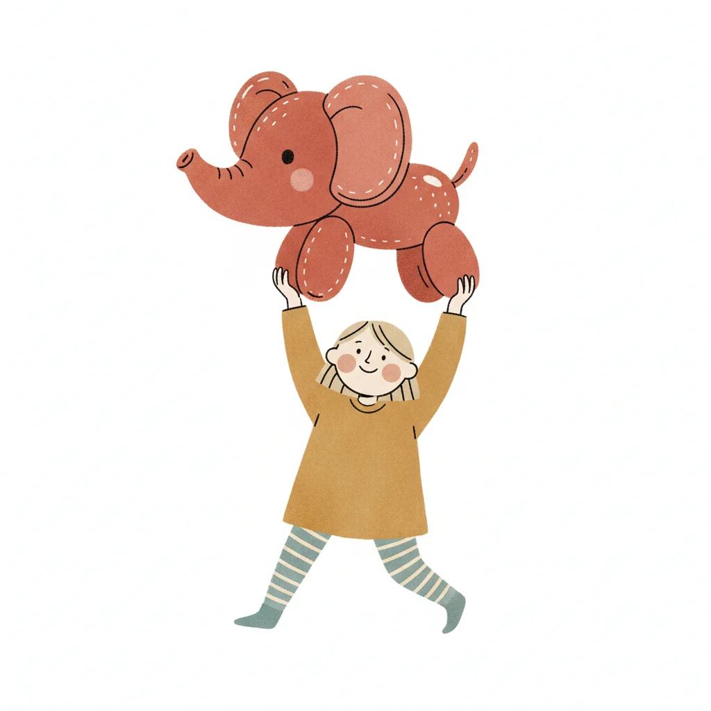 Kind hebt einen Spielzeugelefanten freudig in die Luft.