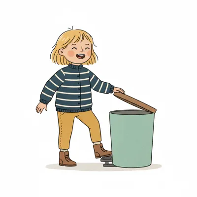 Ein fröhliches Kind öffnet einen Abfallbehälter mit einem Lächeln.