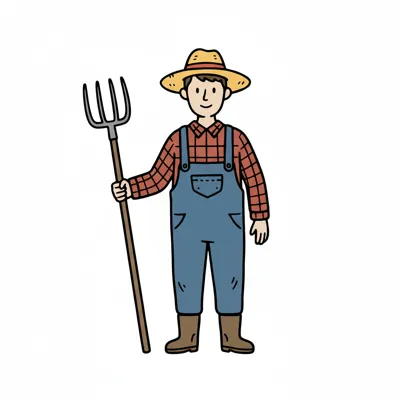 Ein Bauer mit einer Heugabel trägt einen Hut und Latzhose.