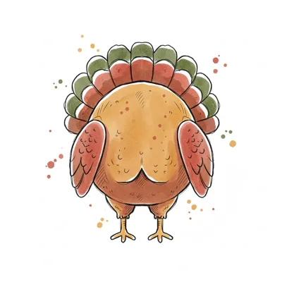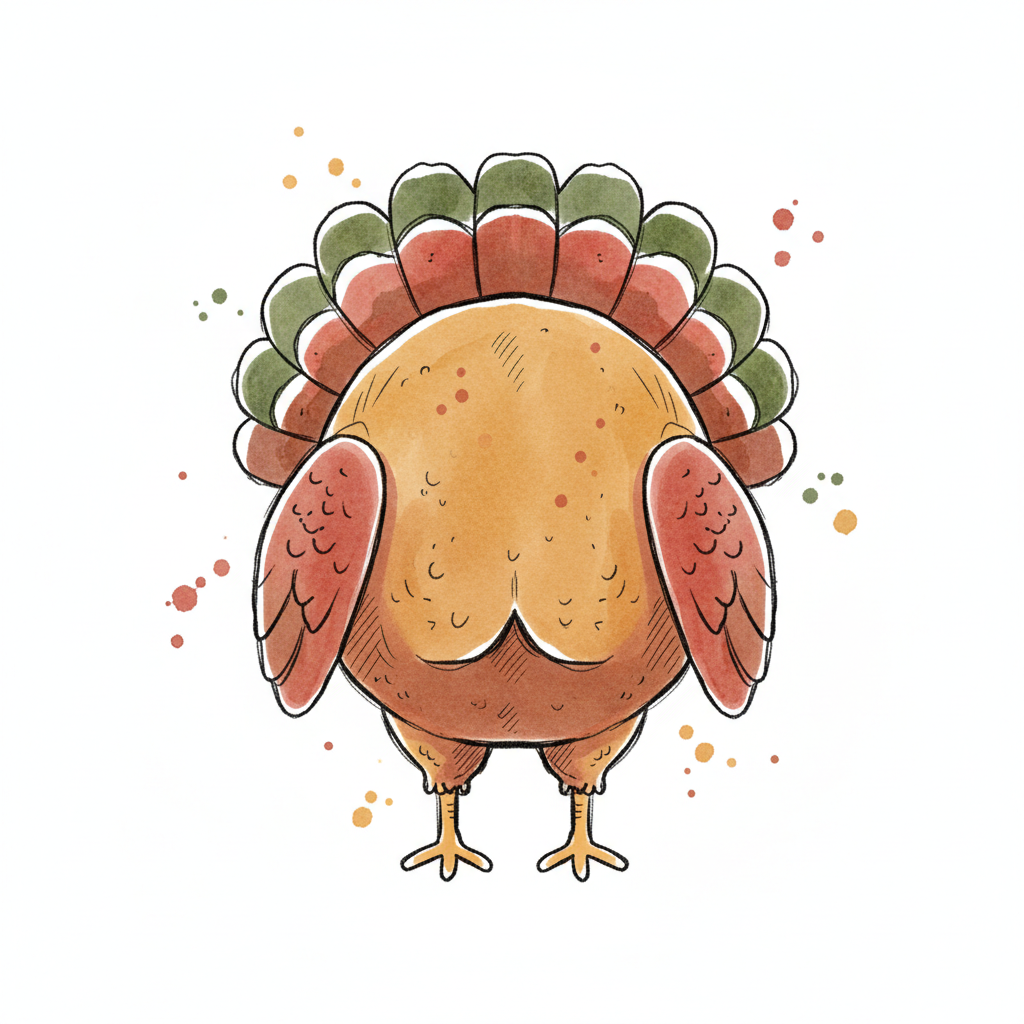 Niedliche Cartoon-Truthahn-Illustration von hinten mit bunten Federn und Aquarell-Spritzern.