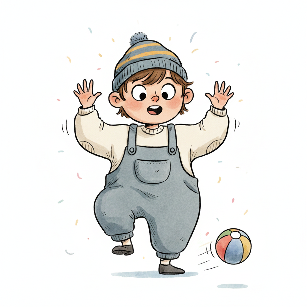 Niedliches Cartoon-Kind in Mütze und Latzhose spielt aufgeregt mit einem bunten Ball.
