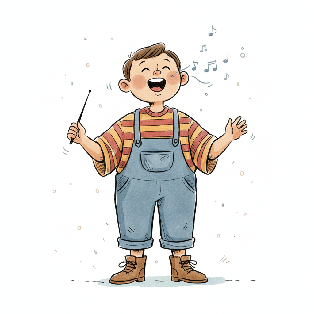 Fröhlicher Cartoon-Junge in Latzhose singt und dirigiert mit einem Stab, Noten fliegen.