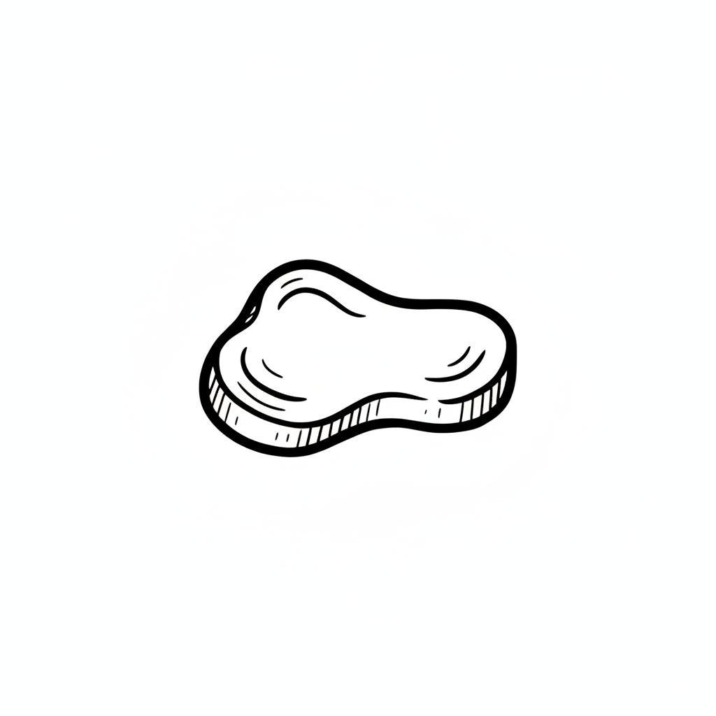 Schwarz-weiße, handgezeichnete Skizze eines Stücks Fleisch oder Steaks auf weißem Hintergrund.