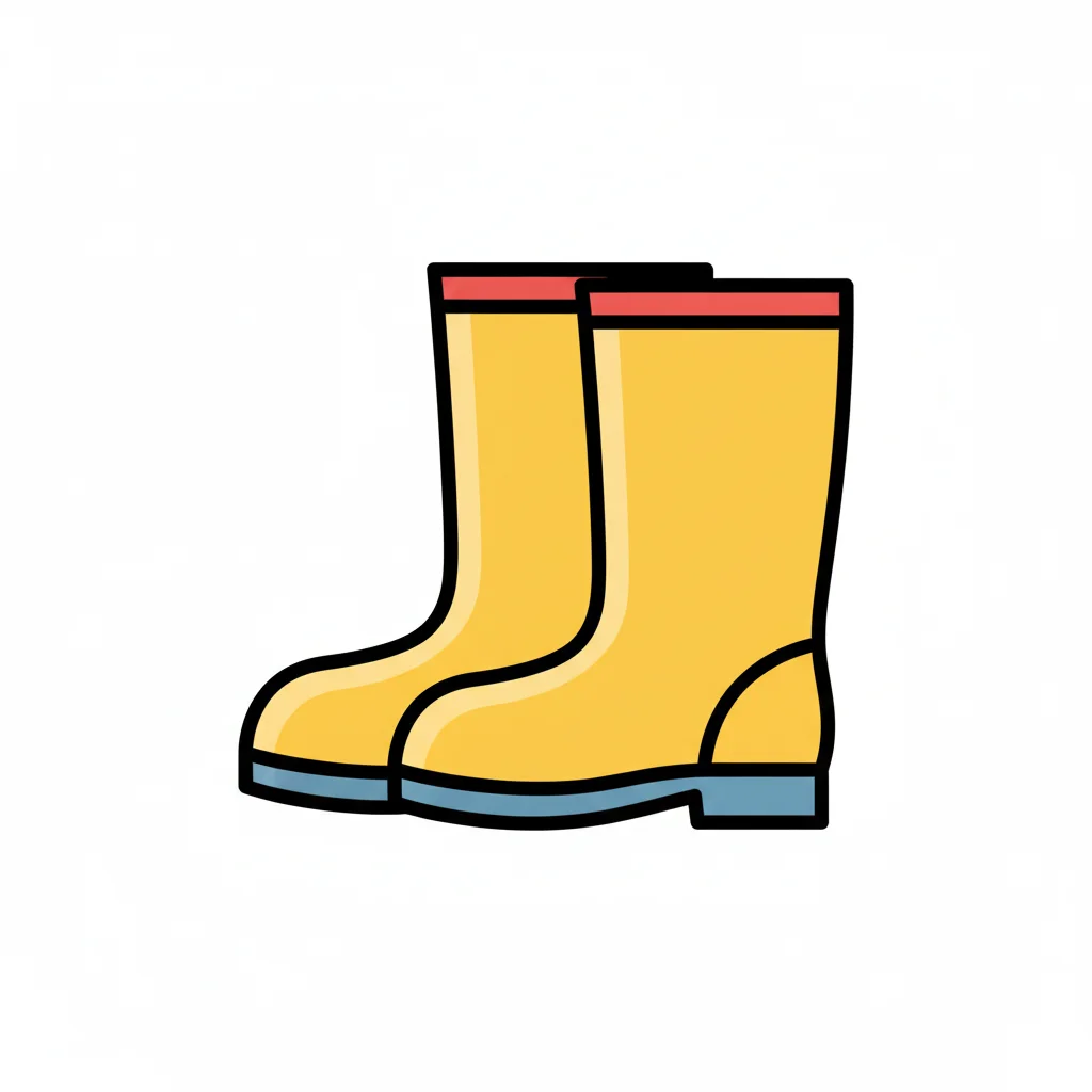 Illustration von zwei gelben Gummistiefeln mit roten Rändern und blauen Sohlen auf weißem Hintergrund.