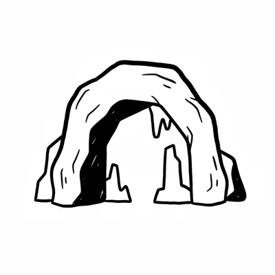 Einfache Schwarz-Weiß-Illustration eines Höhlenbogens mit dunklem Eingang und Felsformationen.