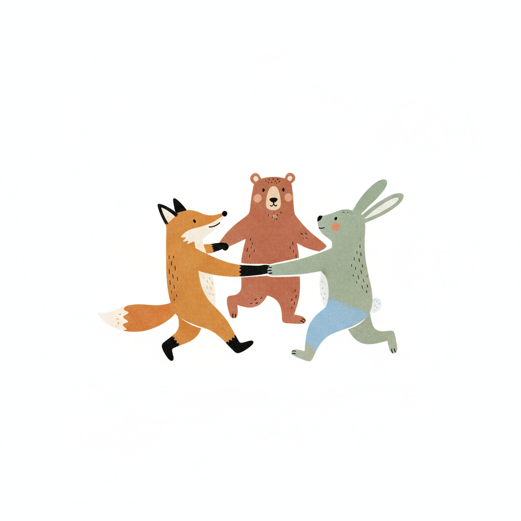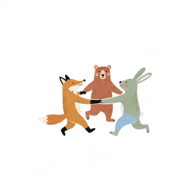 Niedliche Illustration von Fuchs, Bär und Hase, die im Kreis tanzen und Händchen halten.