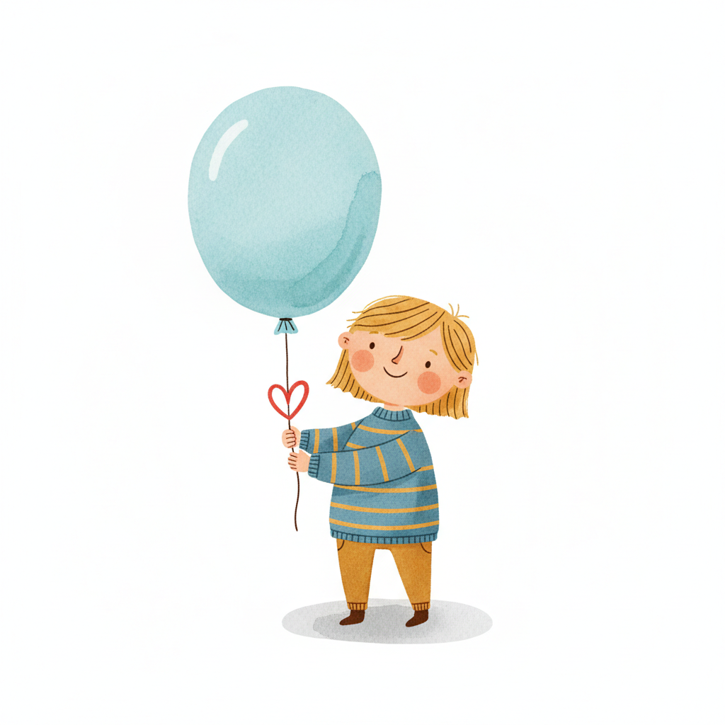 Illustration eines lächelnden Kindes mit blonden Haaren, das einen hellblauen Ballon mit Herz hält.