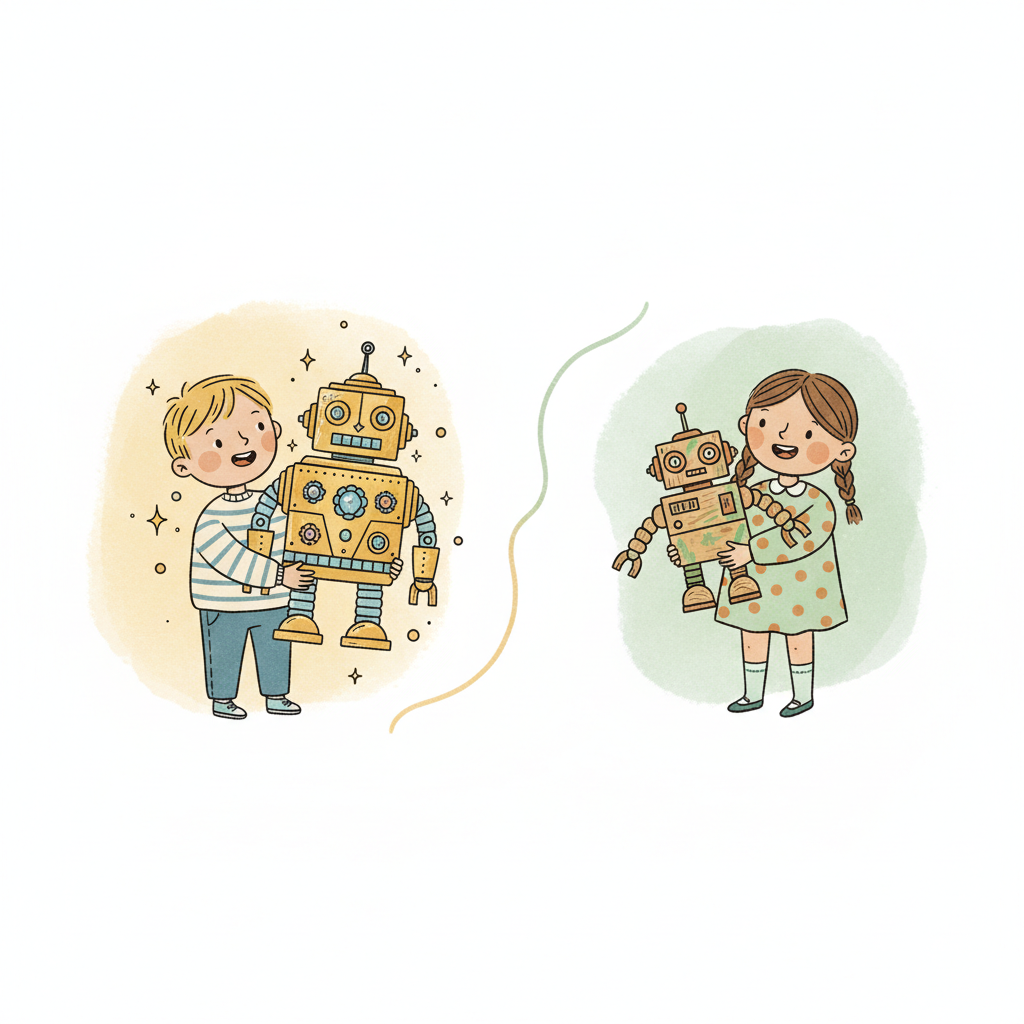 Junge und Mädchen halten Roboter-Spielzeuge in ihren Händen, getrennt durch eine Linie.