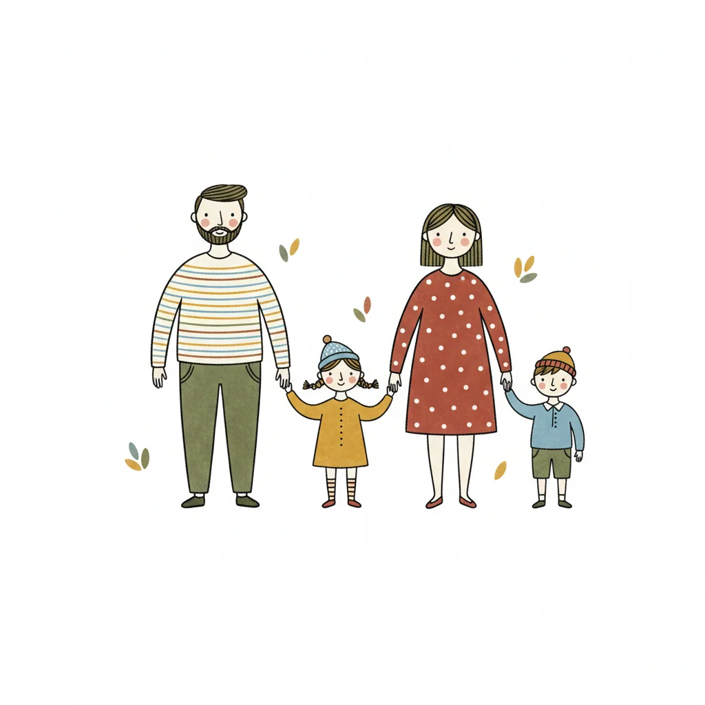 Illustration einer Familie (Vater, Mutter, zwei Kinder) die Händchen halten, mit Blättern.