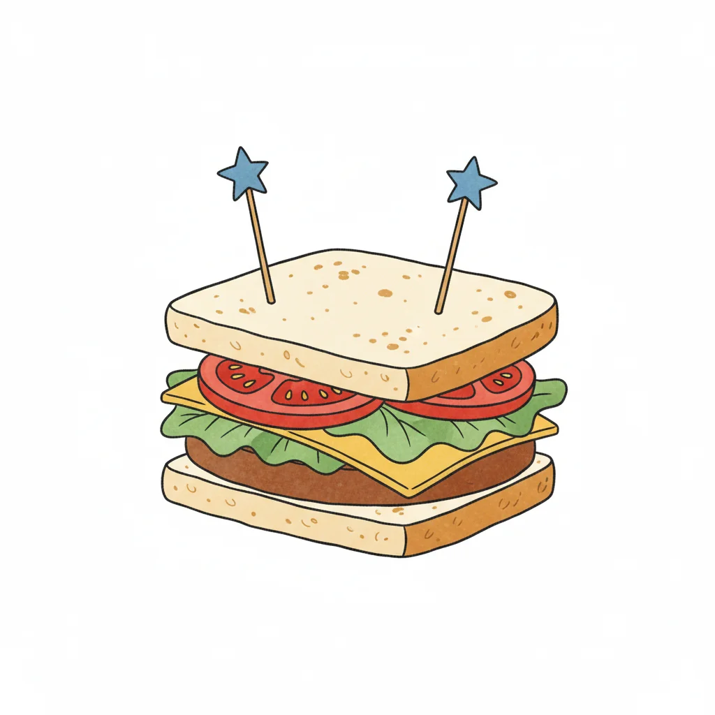 Cartoon-Sandwich mit Salat, Tomate, Käse und Patty, gehalten von Stern-Spießen.