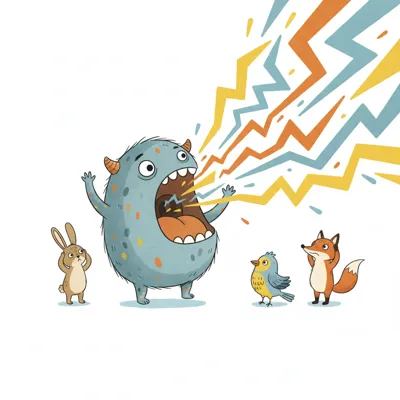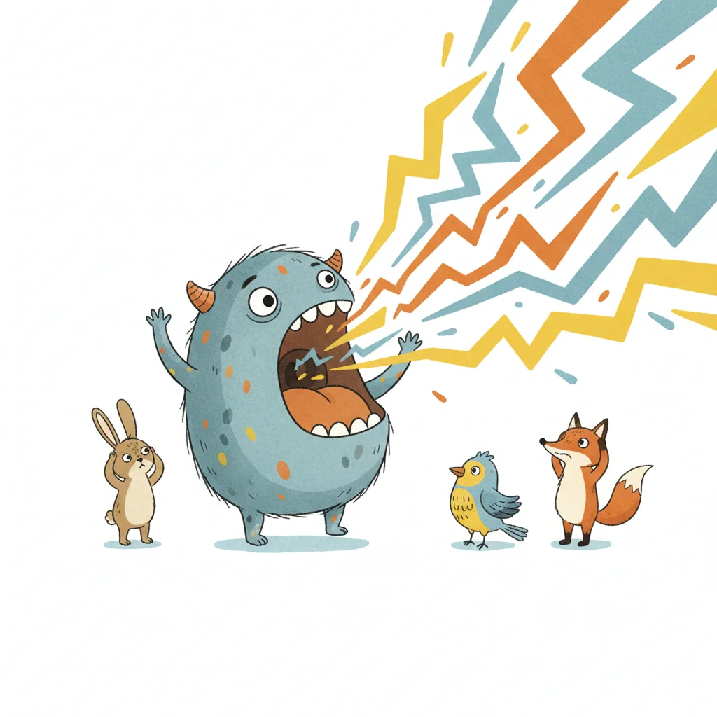 Ein Monster brüllt Blitze, während drei Tiere sich die Ohren zuhalten.