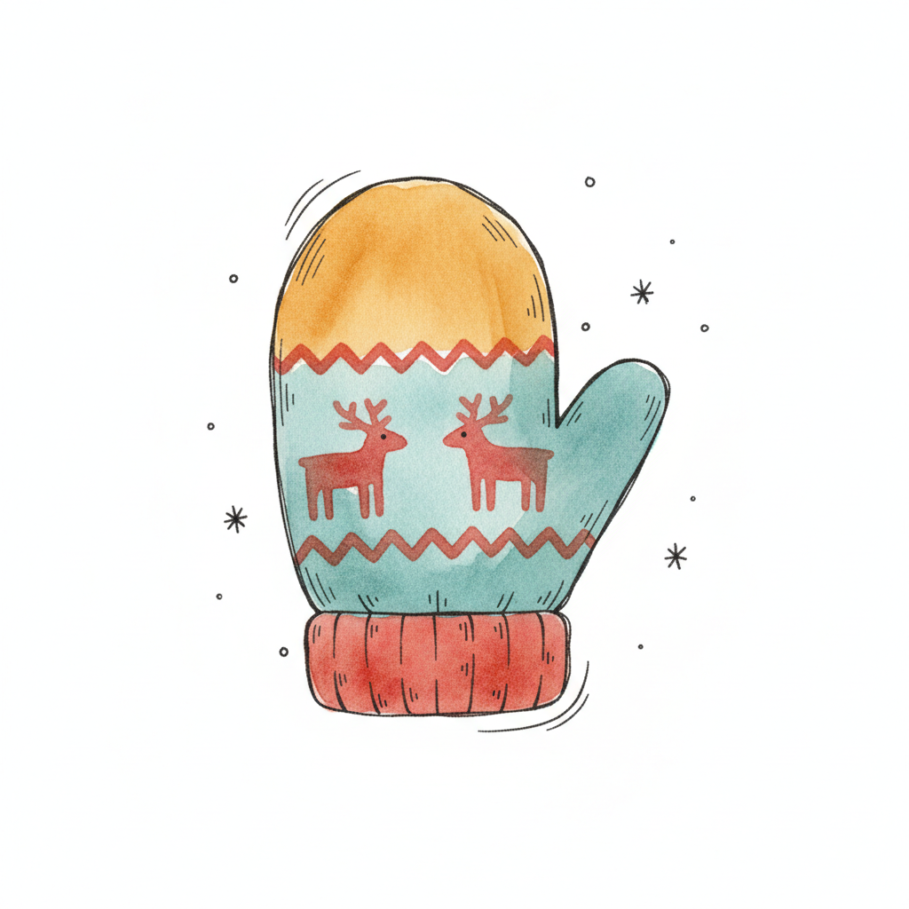 Bunte Winterhandschrift mit Rentier-Motiv und Zickzack-Muster.