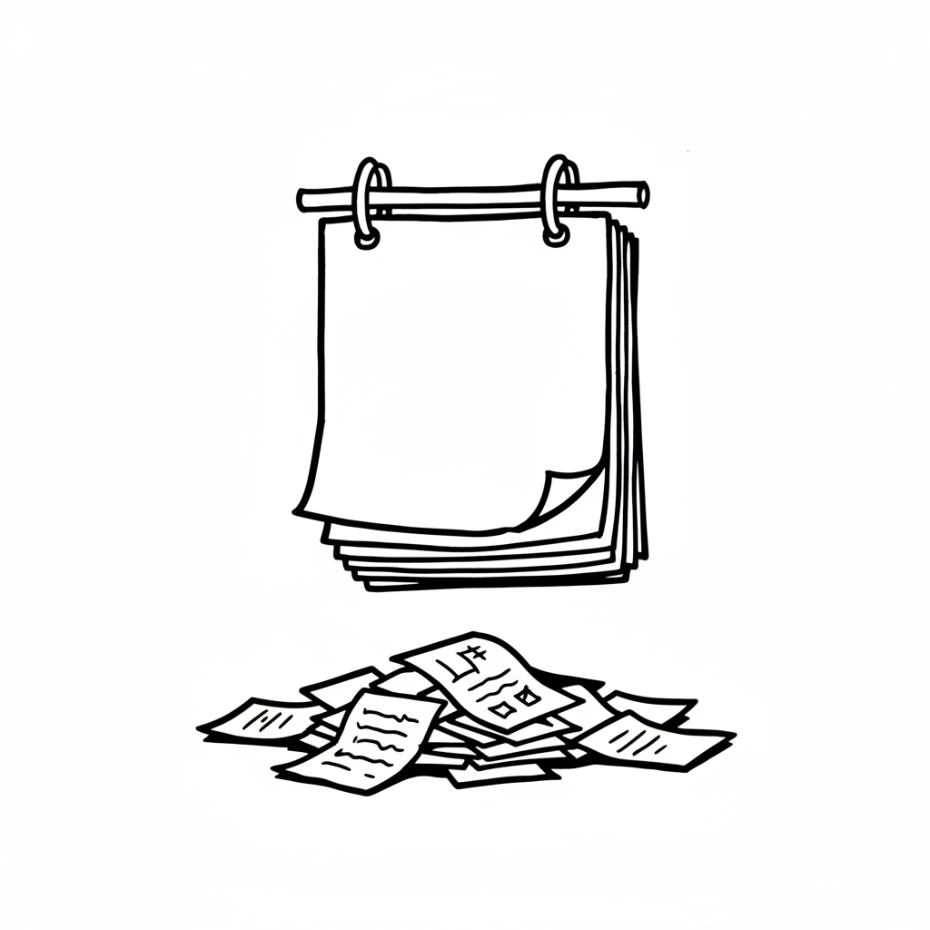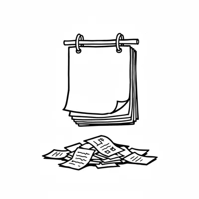 Skizze eines Notizblocks mit leeren Blättern über einem Haufen benutzter Papiere.