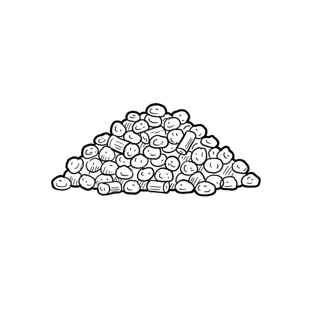Schwarz-weiße Skizze eines Haufens kleiner, runder und zylindrischer Pellets.