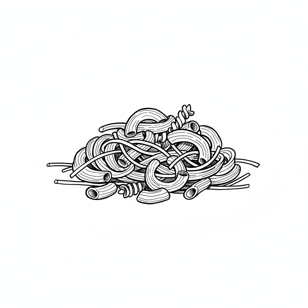 Schwarz-weiße Illustration eines Haufens verschiedener Nudelsorten wie Makkaroni, Spaghetti und Fusilli.