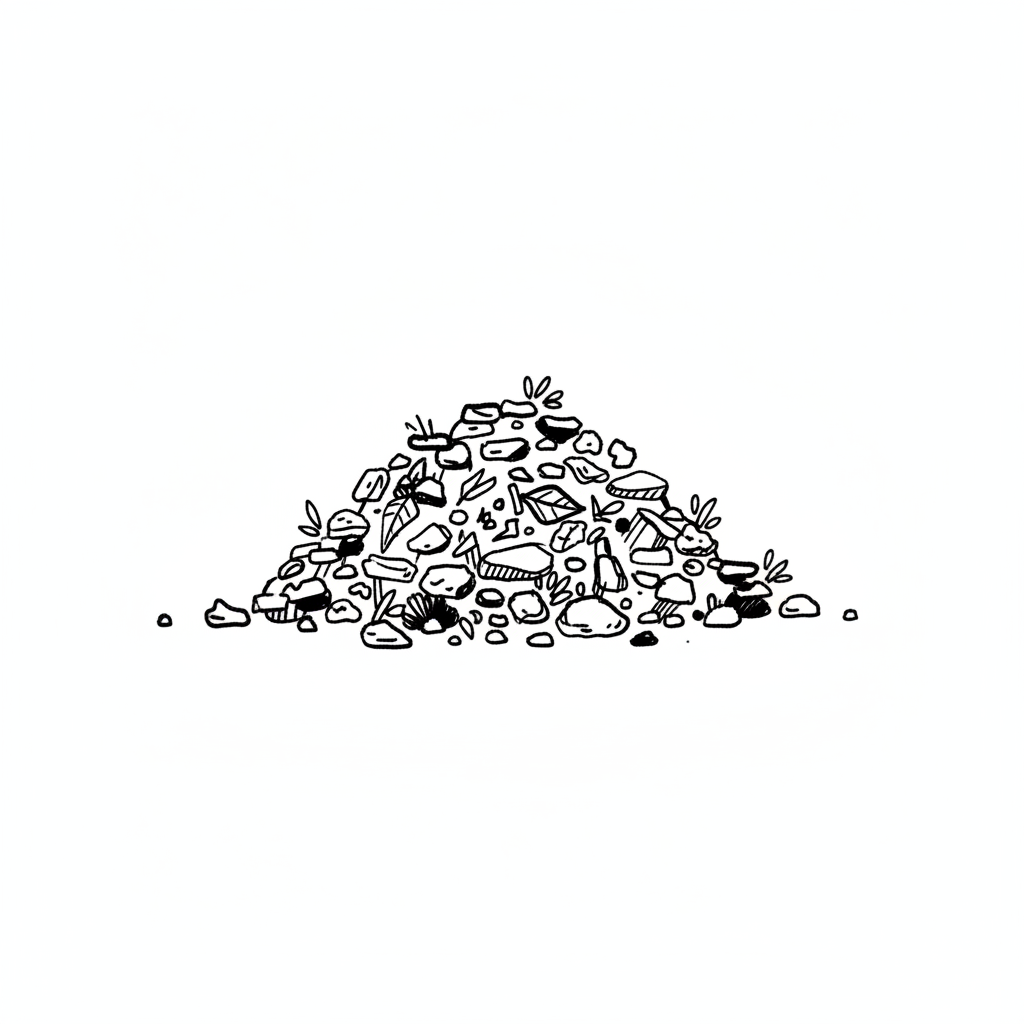 Schwarz-weiße Skizze eines Haufens aus Steinen, Kieselsteinen und Laub.