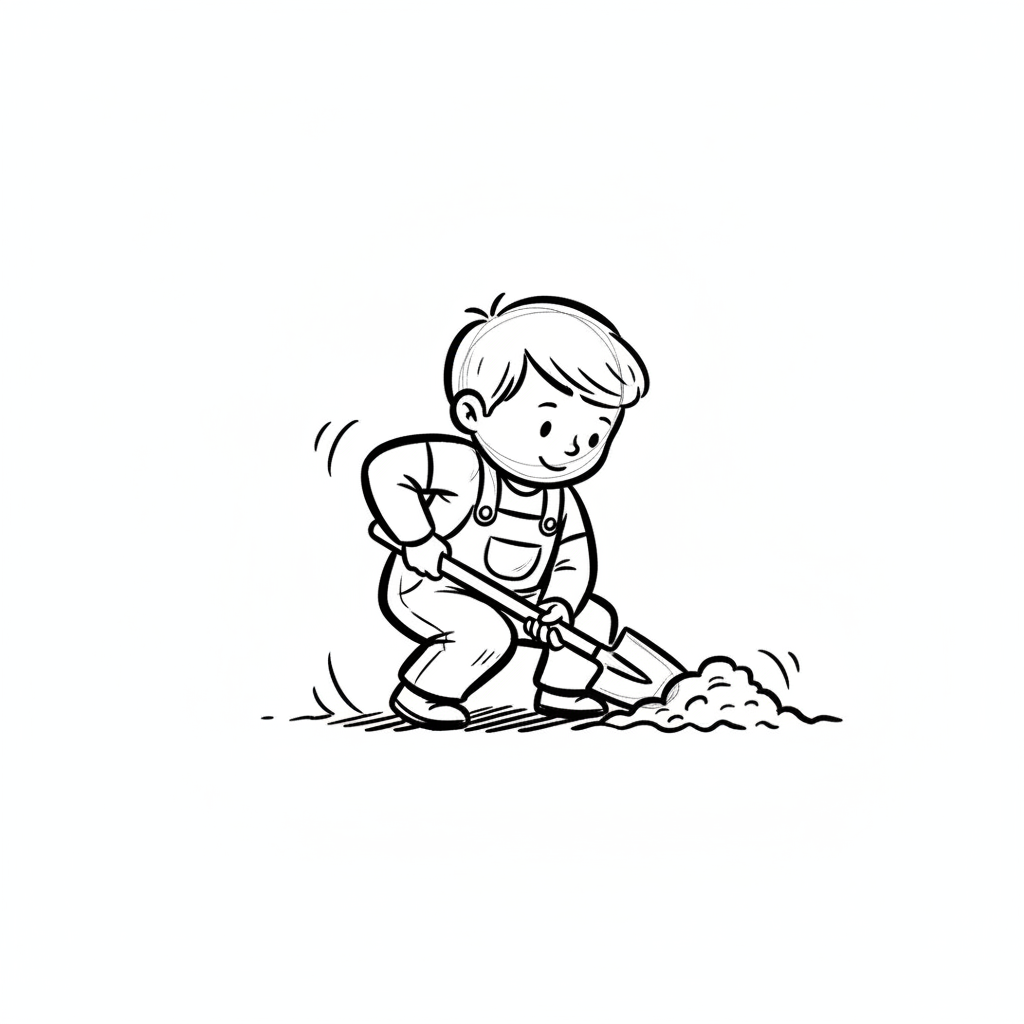 Ein lächelnder Junge in Latzhose gräbt mit einer Schaufel in einem Haufen Erde.
