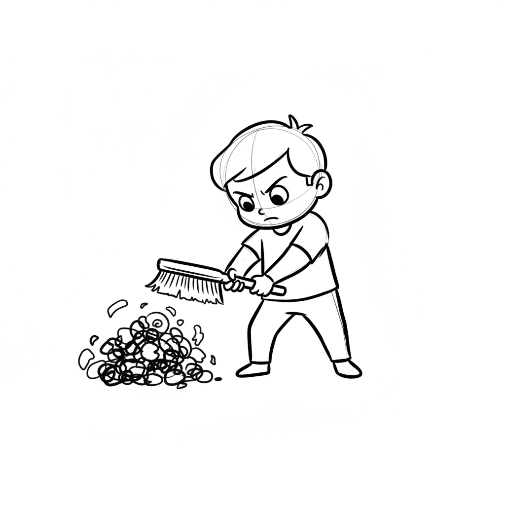 Wütender Cartoon-Junge fegt einen Haufen Schmutz mit einem Besen. Schwarz-Weiß-Skizze.