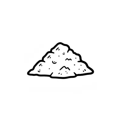 Schwarz-weiße Skizze eines kleinen Haufens aus körnigem Material, wie Sand, Mehl oder Zucker.