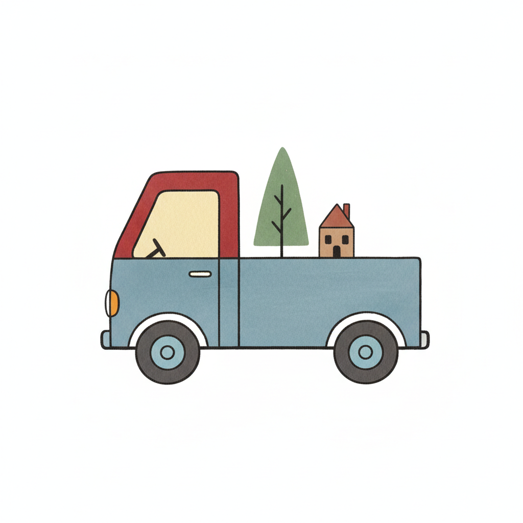 Ein farbenfroher Truck mit Baum und Haus im Ladebereich.