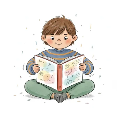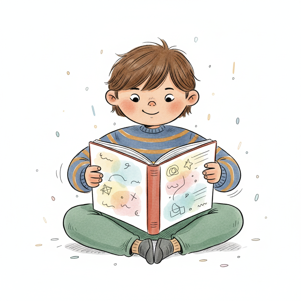 Ein Junge sitzt im Schneidersitz und liest ein buntes Buch.