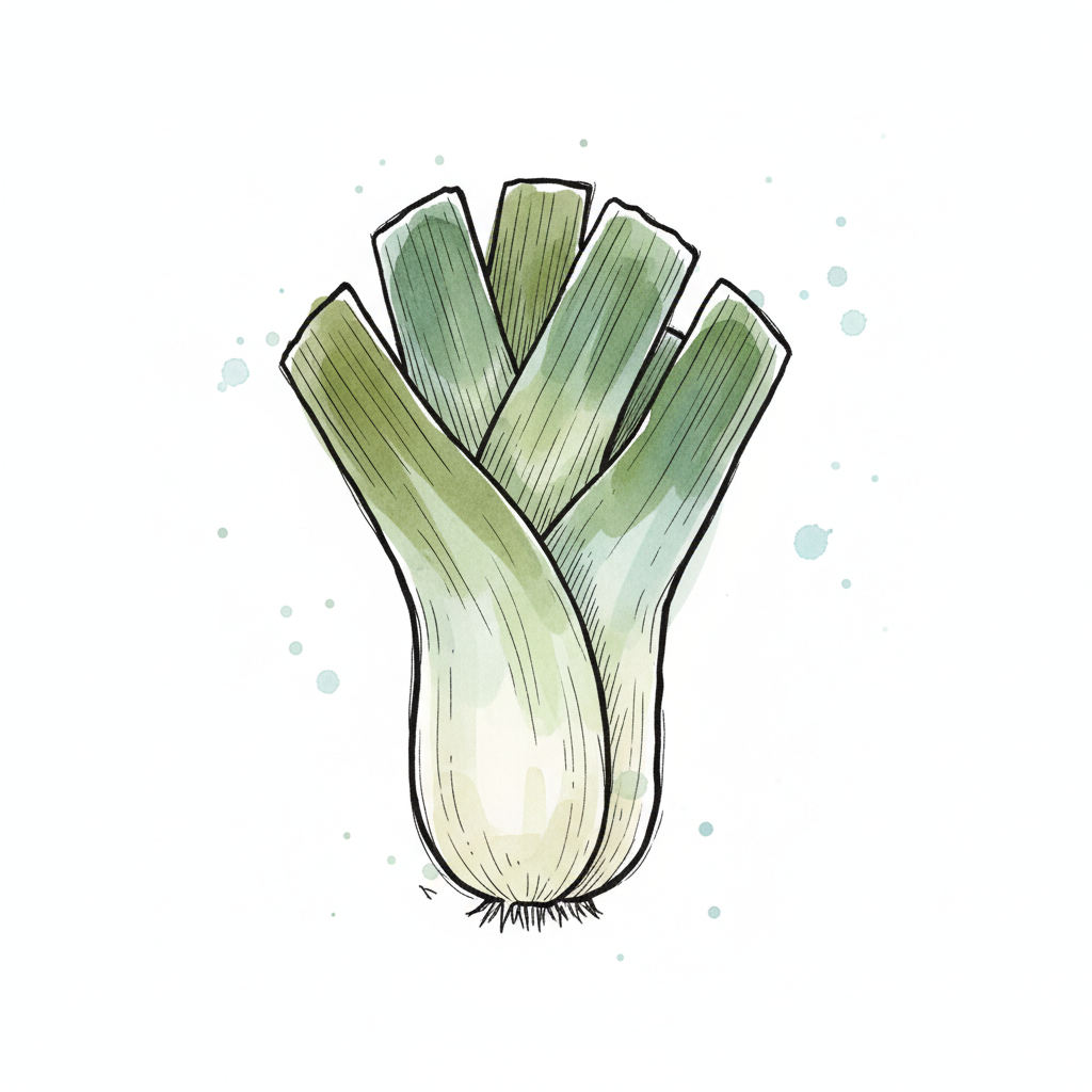 Stilisierte Zeichnung eines Lauchs mit grünen Blättern und hellem Stiel auf weißem Hintergrund.