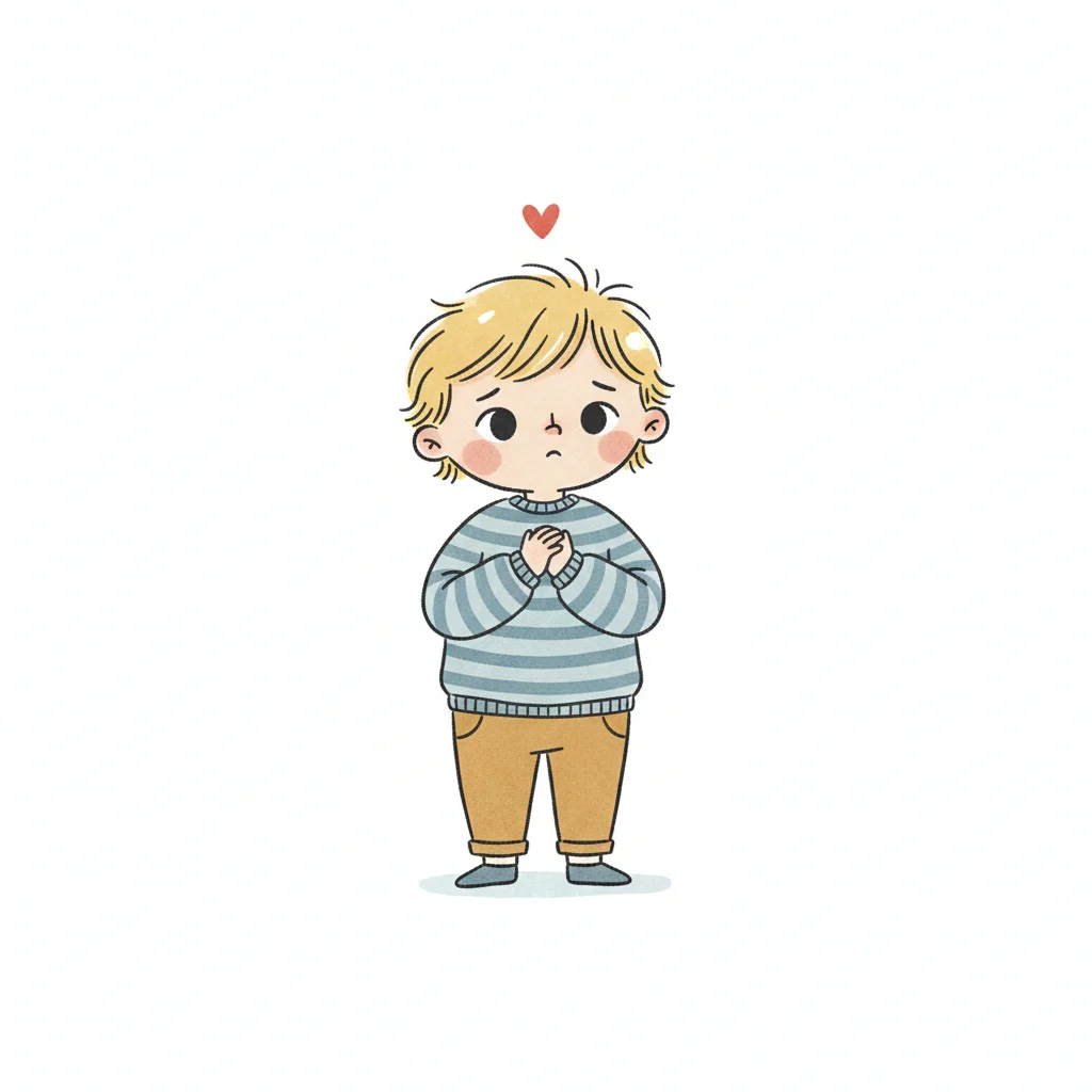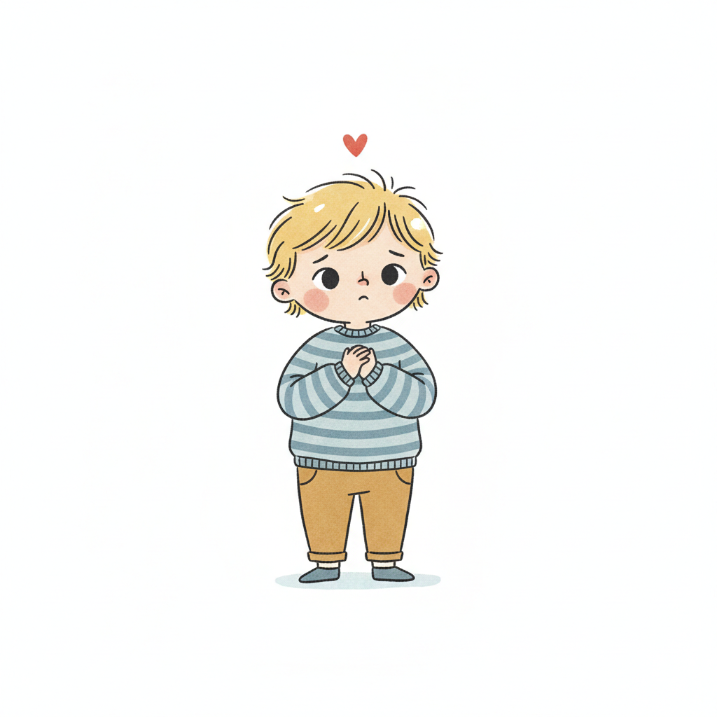 Handgezeichnete Kinderbuchillustration im modernen skandinavisch-nordischen Stil. Minimalistische, freundliche Figur mit einfachen Formen und leicht unregelmäßigen, handgezeichneten Linien. Ruhige, gedeckte Farbpalette, viel freie Fläche, reduzierte Details, sanfte Papier- oder Aquarellstruktur. Warme, ruhige, leicht humorvolle Stimmung, flächige Komposition ohne starke Perspektive, moderner nordischer Illustrationsstil, charmant und zeitlos.