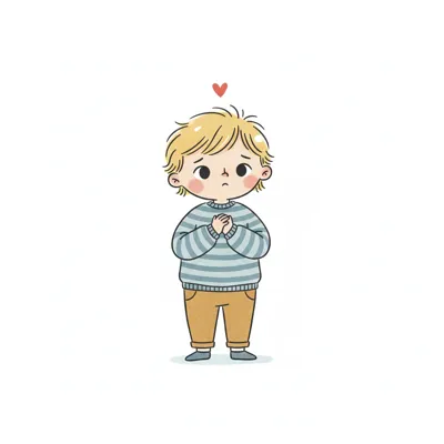 Ein Junge mit blonden Haaren, der schüchtern aussieht und ein Herz über sich hat.