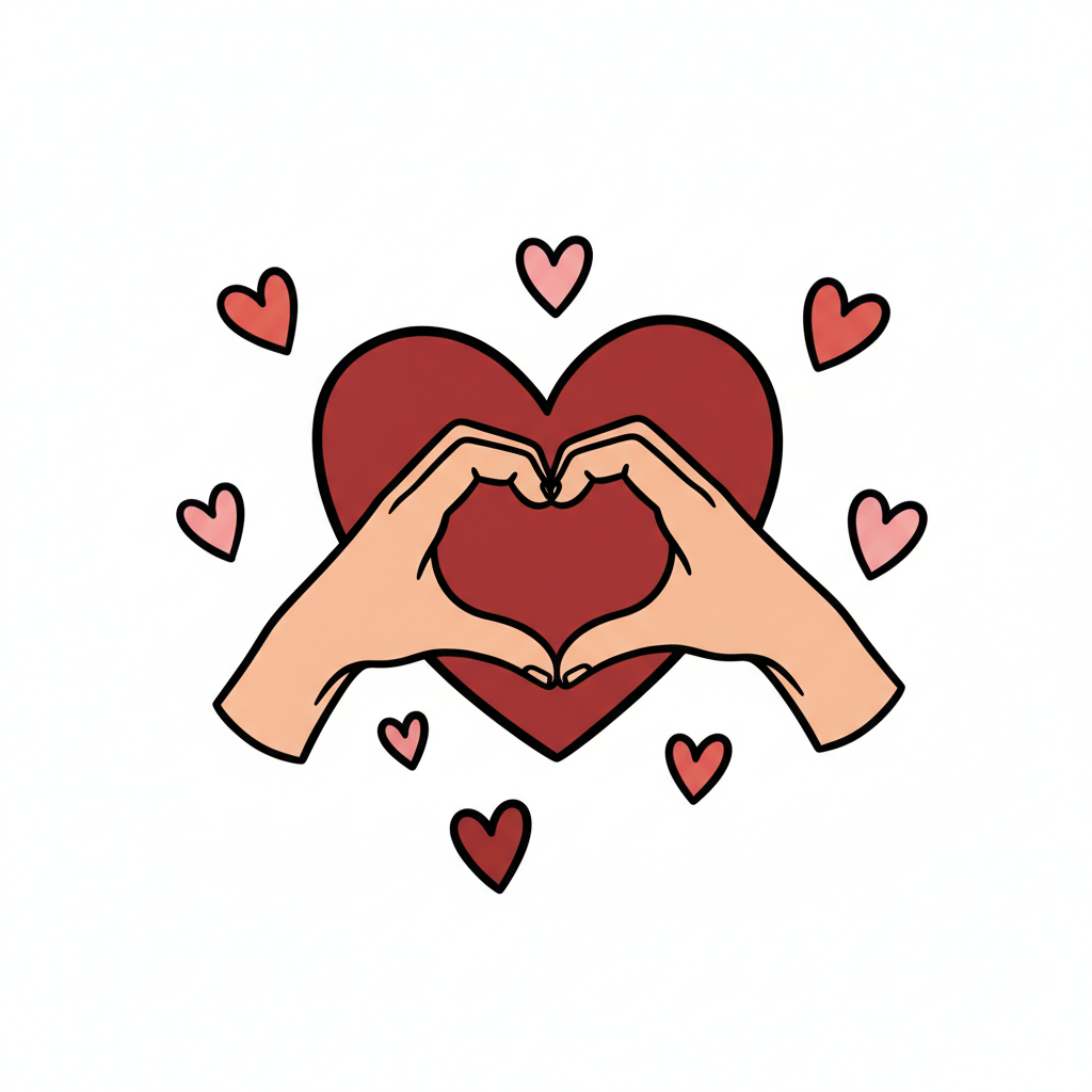 Hände formen ein Herz umgeben von kleinen Herzen.
