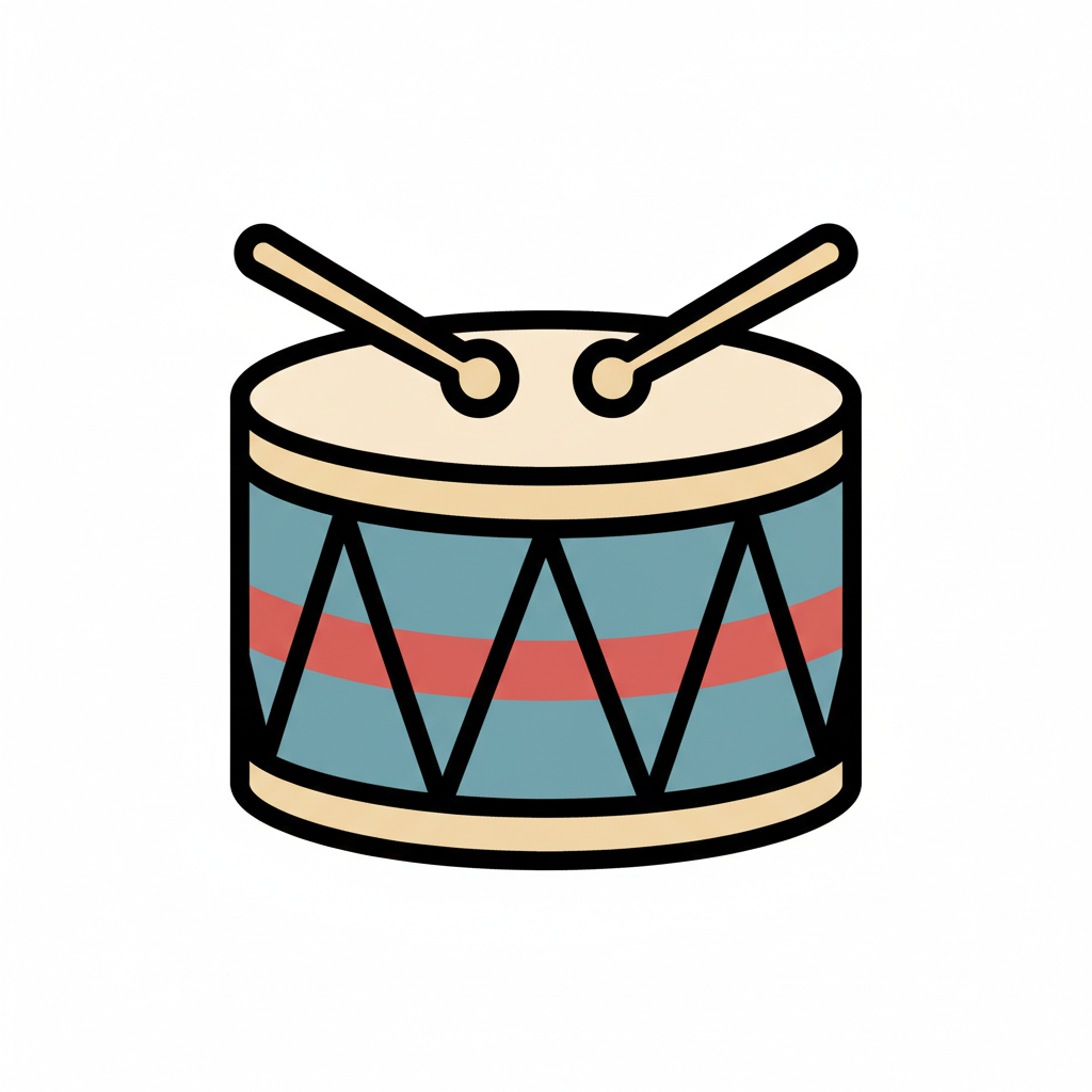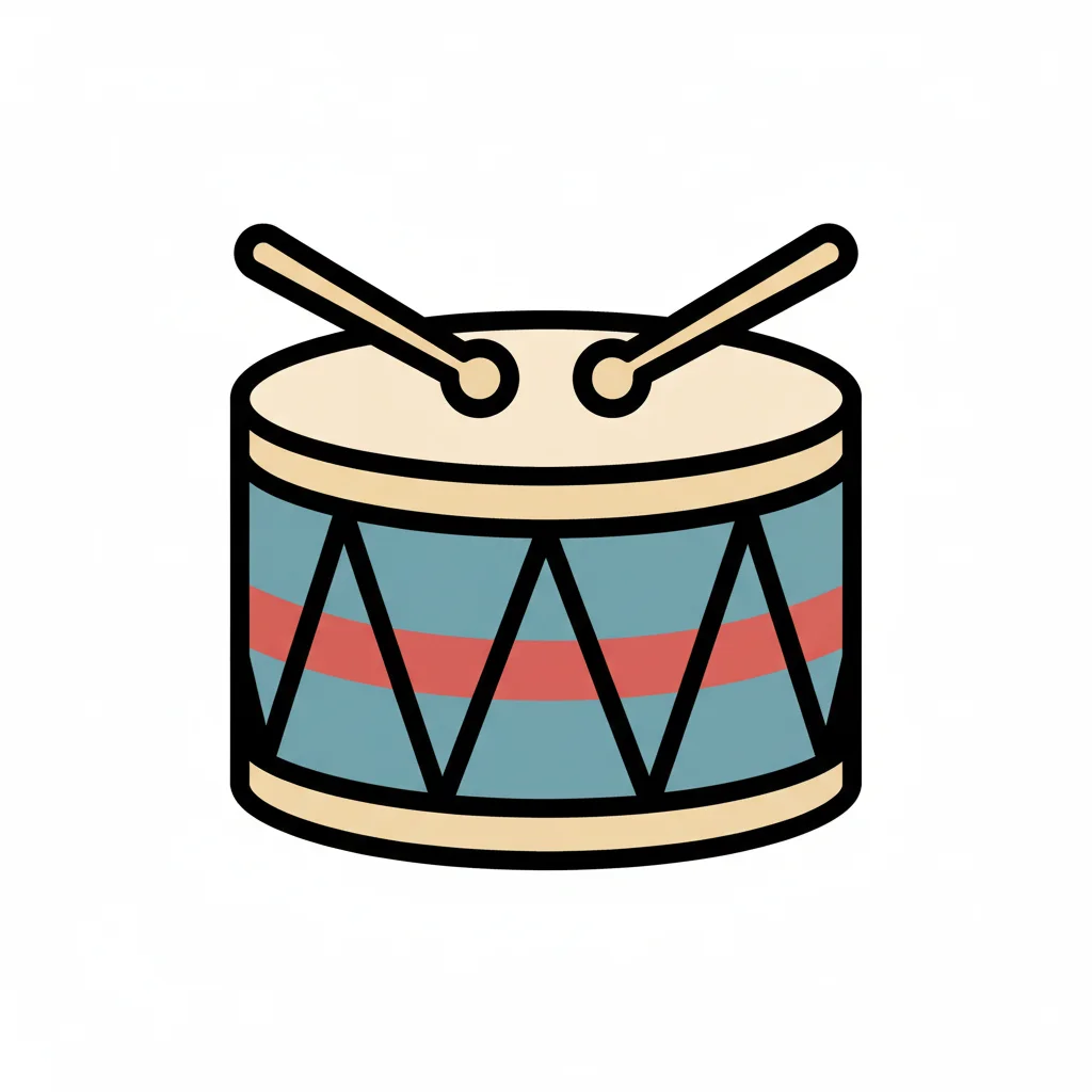 Bunte Cartoon-Trommel mit zwei Schlägeln, blau mit roten Streifen auf weißem Hintergrund.