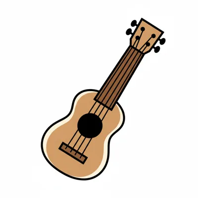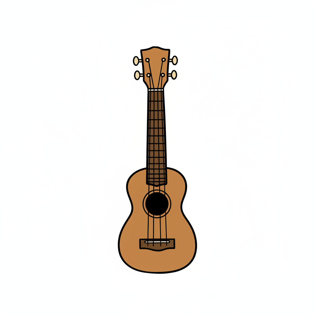 Eine einfache, cartoonartige Illustration einer braunen Ukulele auf weißem Hintergrund.