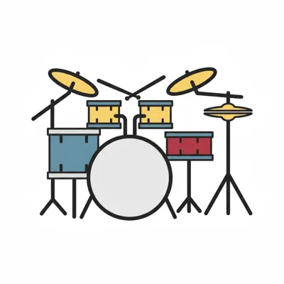 Buntes Schlagzeug-Set im Cartoon-Stil mit Trommeln, Becken und Drumsticks auf weißem Hintergrund.